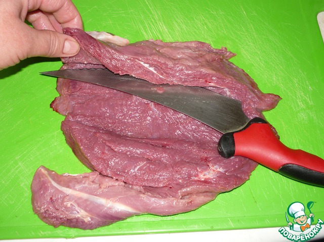 Грудку разрезаем вдоль таким образом, чтобы ее можно было раскрыть, как книжку. Накрываем пленкой и отбиваем до толщины 0.5 см.