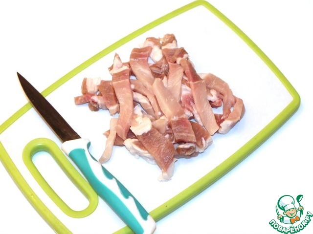 Не до конца размороженное мясо вымыть, обсушить и нарезать очень тонко.