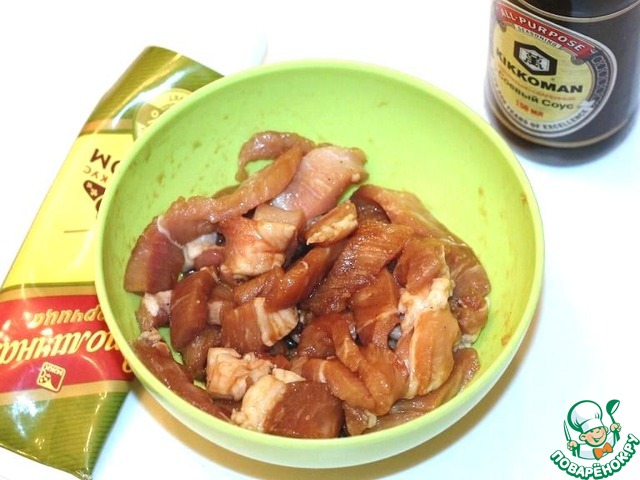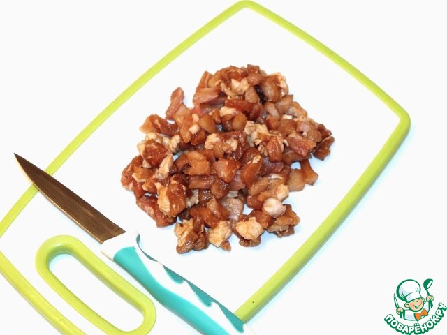 Смазать мясо соусом: смесью горчицы и соевого соуса 1:3. Или соевого соуса и лимонного сока. Оставить на время приготовления начинки.
