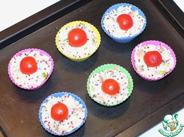 Затем смешиваем яйцо со сметаной, солим и поливаем понемногу на кексы сверху. Ставим на 3-5 минут в духовку до готовности яйца.