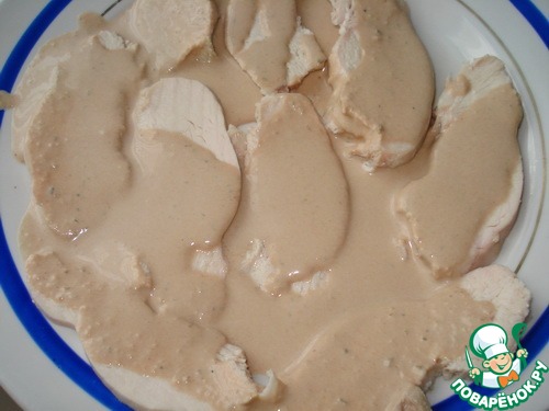 Готовое отварное куриное мясо нарежим на кусочки. Выкладываем на блюдо. Смазываем каждый кусок курицы соусом из тунца.