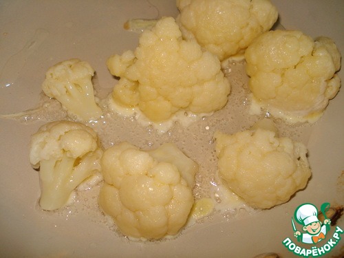 Откидываем капусту. Яйцо взбиваем, обмакиваем кусочки цветной капусты и обжариваем немного на сковороде. (можно запечь в духовке).