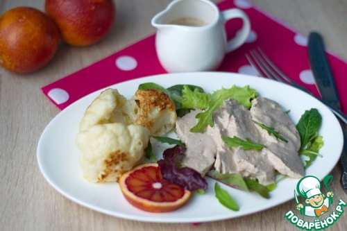 На блюдо выкладываем цветную капусту, кусочек апельсина, смесь салатных листьев и кусочки курицы.