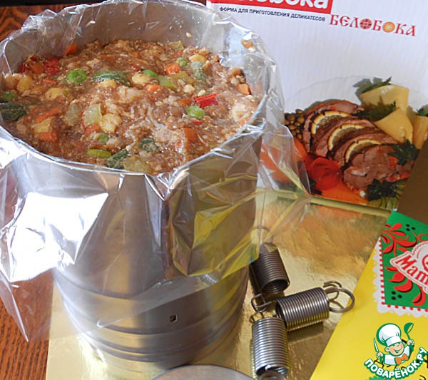 Мясная заготовка с приправами у меня осталась от приготовления Ветчины "Сборной" http://www.povarenok .ru/recipes/show/780 39/ (автоматические пробелы убирайте). То есть приготовить её нужно по тому же алгоритму (не забудьте чеснок, желатин, специи).