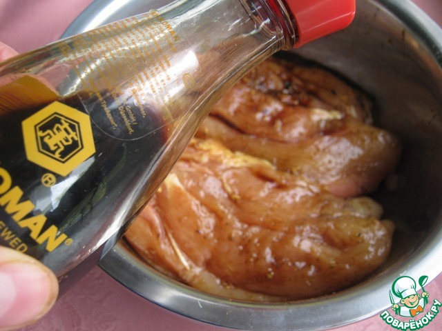 Берём куриные грудки и маринуем их с соевым соусом Киккоман и специями для курицы.