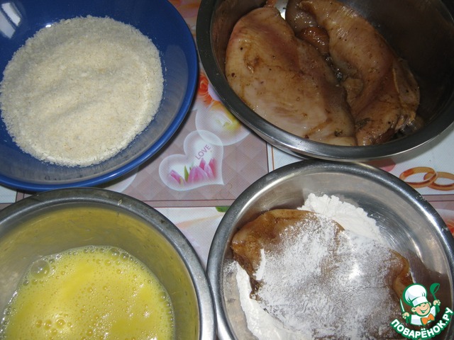 Перед готовкой грудки немного отбиваем, обваливаем в муке, в яйце, затем в сухарях.
