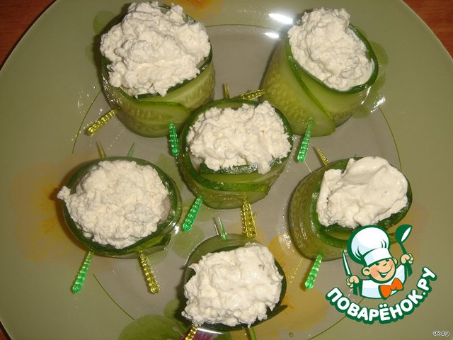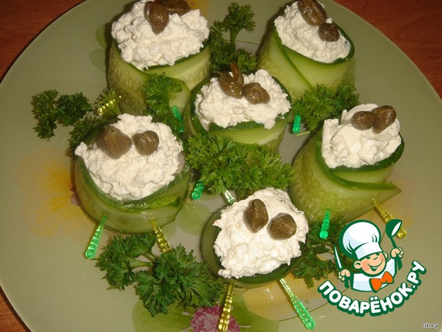 Теперь необходимо полоску сельди скрутить рулетиком, а затем обернуть пластинкой огурца. Причем вверху должно остаться пространство для начинки, т.е. огурец должен выступать на сантиметр от селедки. Для прочности скрепить поперек шпажками крест накрест.