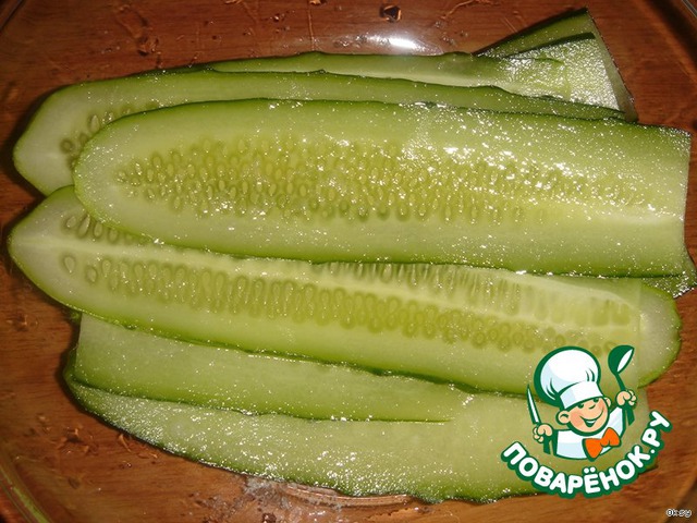 Огурец (длинный, толсты и ровный :-) ) нужно порезать вдоль тонкими пластинками и хорошо присыпать солью, чтобы огурец дал сок и пластинки стали гибкими. После их нужно промыть и обсушить на бумажных полотенцах.