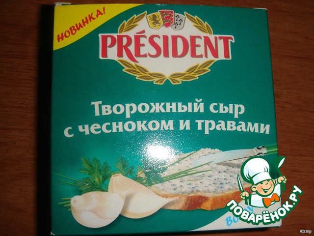 Для начинки я взяла вот такой сыр с чесноком и травами. Его пикантный вкус очень гармонично вписался в эту композицию.