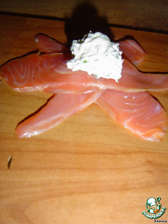 И собираем концы рыбных пластинок в кулечек (рыба очень хорошо прилипает к сыру).