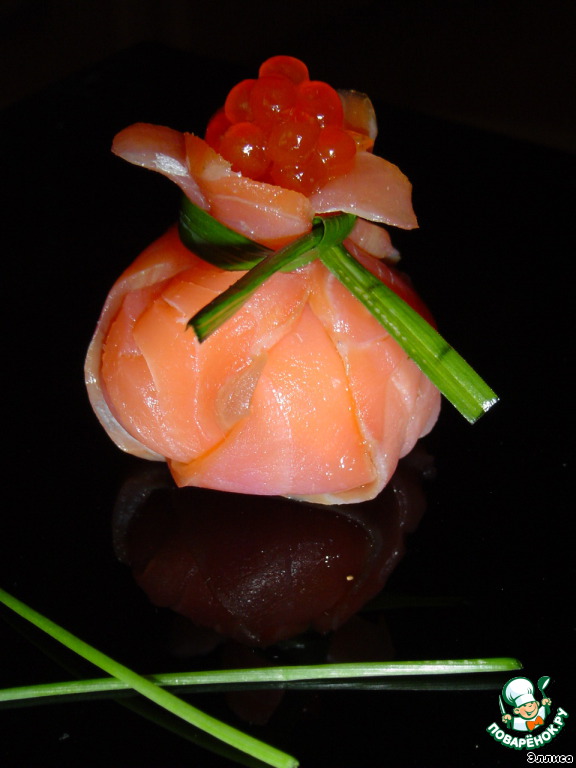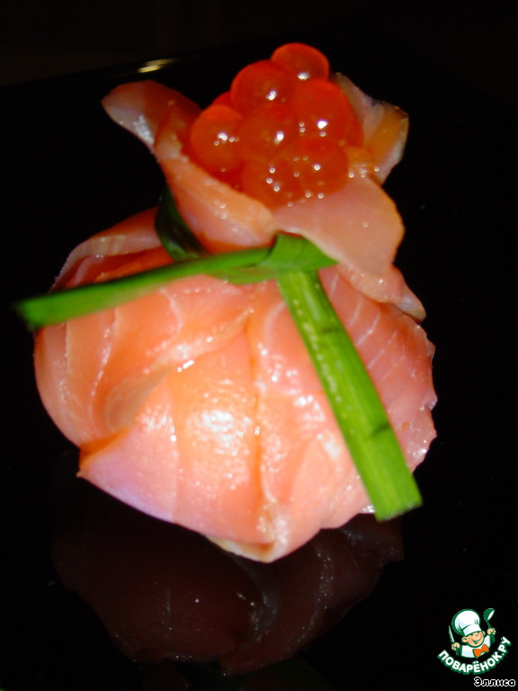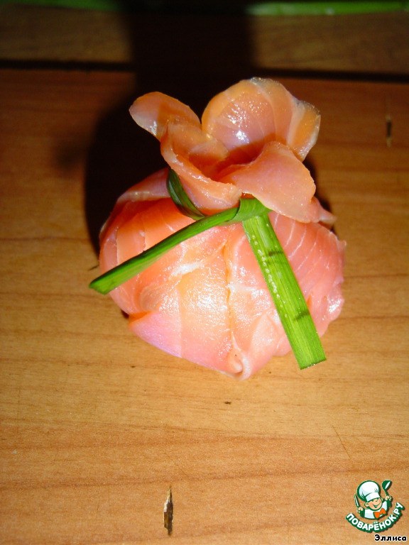 Нарезаем рыбу тонкими пластинами (или берем готовую нарезку), выкладываем друг на друга три пластинки.