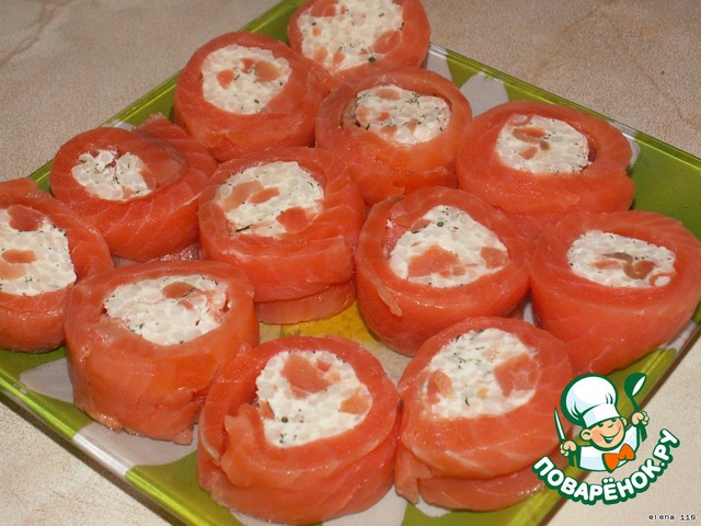 Начинку скатать колбаской, положить посередине на рыбу, с помощью плeнки скатать рулетом.
