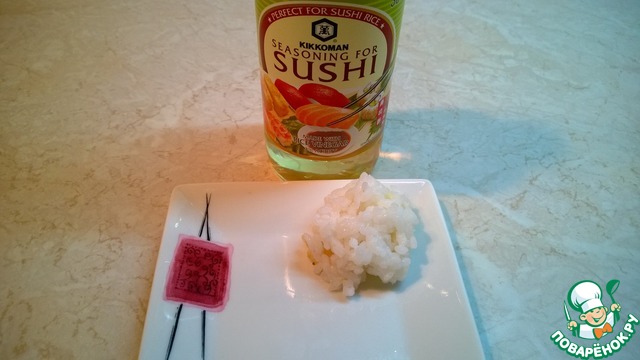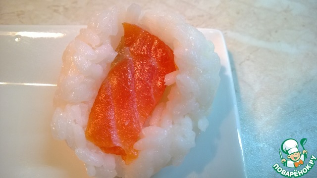 Из остывшего риса, делаем шарик и вкладываем в него кусочек рыбы. Не забываем смачивать руки раствором воды с приправой для суши Кикоман (10:1).
