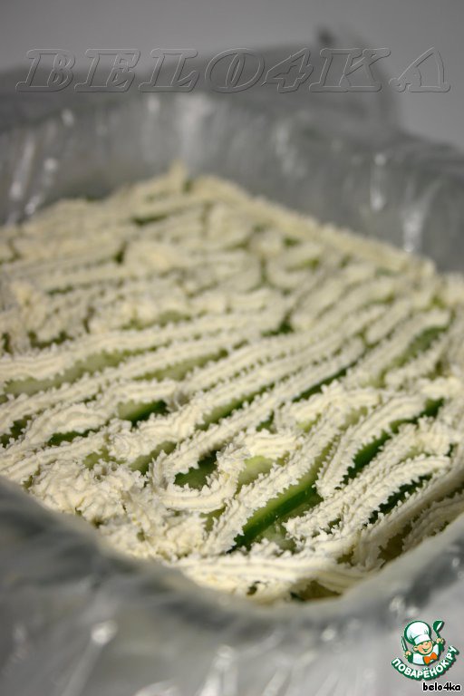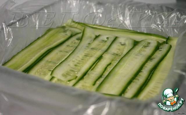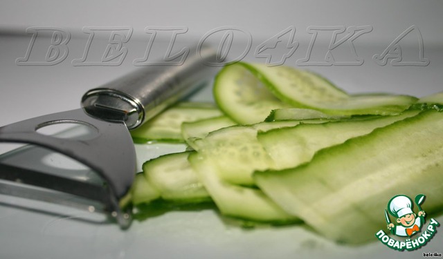 Огурчики тоже тоненько-претоненько нарезаем с помощью овощечистки. И обязательно подсушиваем на бумажном полотенчике, а иначе тортик наш в итоге расплывется.