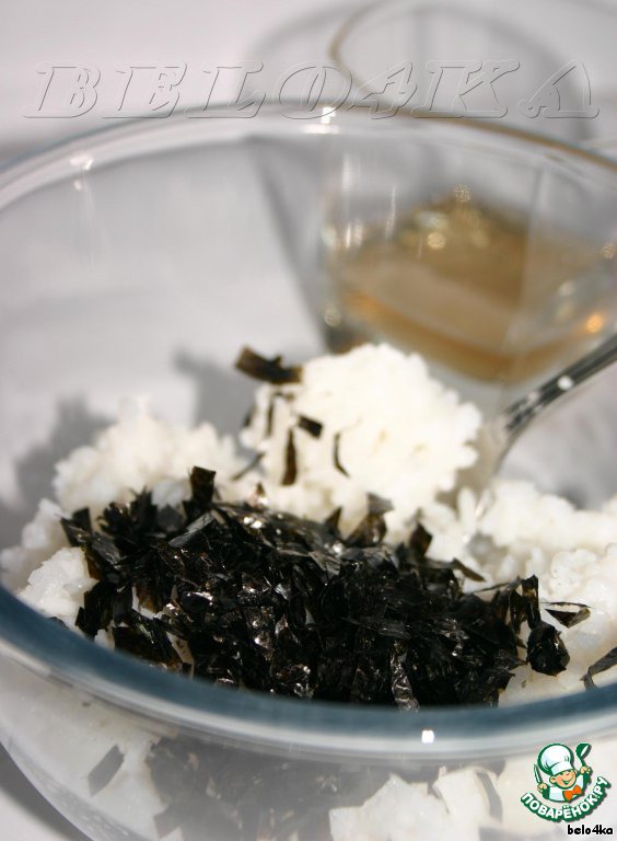 В остывший (до комнатной температуры) рис высыпаем кусочки нори и аккуратненько поливаем уксусом. Теперь не мешаем, иначе рис превратится в кашу, а просто рисуем снежинку, таким образом распределяя нори и уксус.