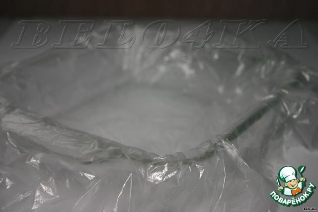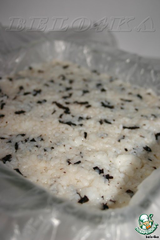 Рис отварить по инструкции на упаковке. У меня был уже готовый, остался после пиршества. Форму (25см на 25см) выстлать пищевой пленкой (у меня, к сожалению, она некстати кончилась, но русский человек всегда найдет замену - я подумала, подумала, да и застелила полиэтиленовыми пакетиками).