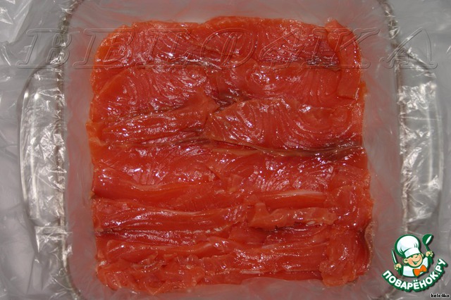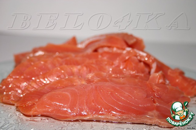 Красную рыбку нарезаем тоненькими (как на продажу) кусочками. Очень тоненькими. Мой любимый размер на бутерброд - 1.5 см толщиной, а тут...улет!