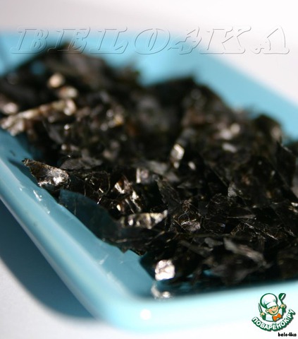 Половинку или целый лист нори порезать мелко ножничками. Я обычно обращаюсь с ними очень осторожно и думала, наивная, что они легко крошатся. Виг вам! Сжала я его в кулачке, потормошила, а он расправился и даже крошечки не отвалилось! Так что орудуем ножничками!