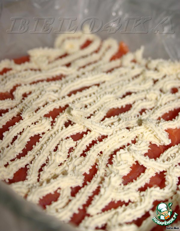 На рыбу выкладываем половину сыра. Так уж исторически сложилось, что, работая с этим сыром, я пользуюсь кондитерским шприцом - удобно и равномерно. Ни в коем разе не агитирую уподобляться мне, все методы хороши.