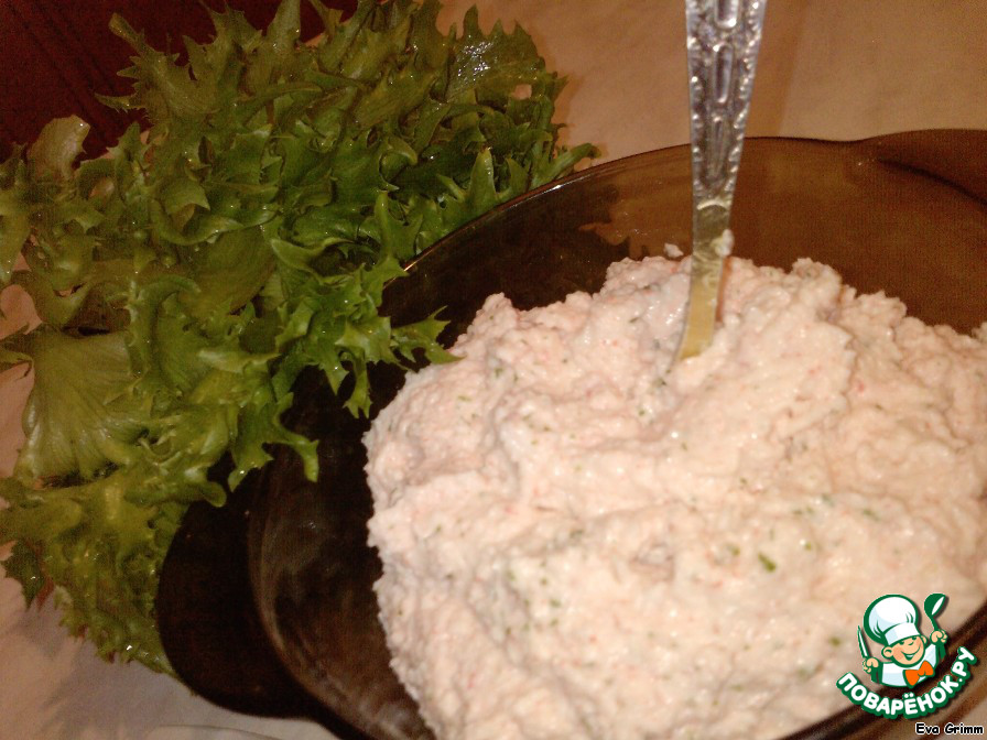 Готовим начинку: мелко режем крабовое мяско, добавляем сметану, специи и зелень. Рубим в блендере до состояния паштета ;-)