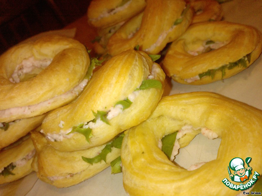 Разрезаем их и наполняем нашим крабовым паштетом, не забыв добавить салатик...
