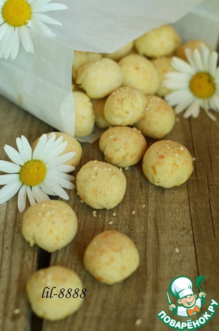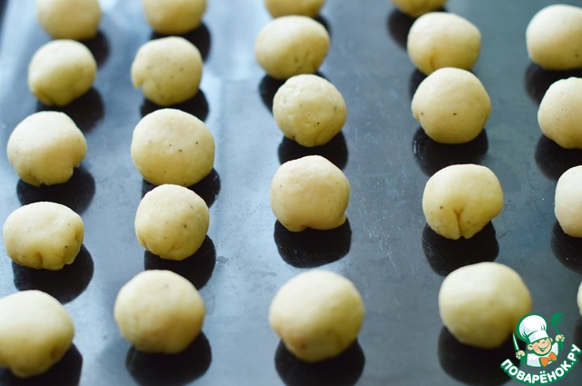 6. Защипнуть края, формируя шарики. Выложить печенье на противень. Духовку разогреть до 200С. Печенье смазать оливковым маслом, посыпать кунжутом. Печь примерно 20-25 минут.