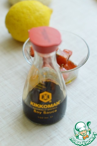 1. Семгу нарезать мелким кубиком, со стороной примерно 0,5 см. В пиале смешать соевый соус, лимонный сок и масло, добавить рыбу, перемешать.