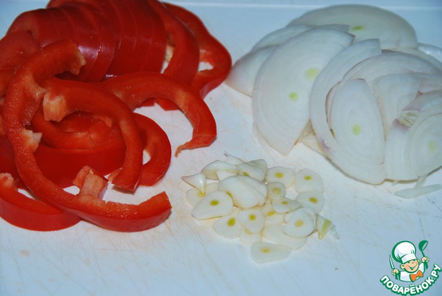 Тонкими полосками нарезаем красный сладкий перец, полукольцами репчатый лук, пластинками чеснок.