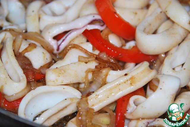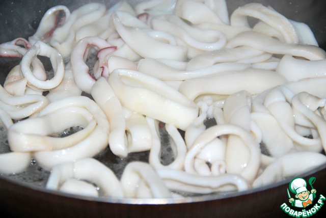 Лучше всего готовить это блюдо на воке, но за неимением можно использовать обычную сковороду. На раскалённом масле (2 ст. ложки) обжариваем кальмаров 2-3 минуты и убираем со сковороды.