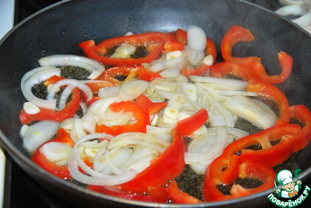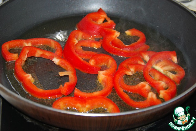 Сковороду протираем, наливаем ещё 2 ст. ложки масла, обжариваем 1 минуту сладкий красный перец.