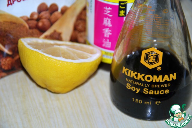 Берём соевый соус "Киккоман", кунжутное масло, лимон (сок от половины лимона), мускатный орех.