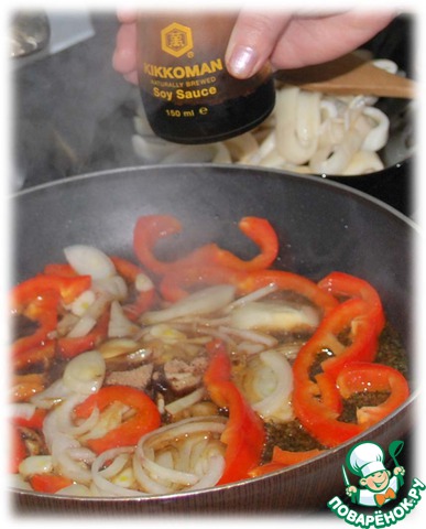 Добавляем обжаренные кальмары, молотый чёрный перец, солим (можно и не солить, в соевом соусе соли достаточно). Всё перемешиваем, убавляем огонь и протушиваем ещё 2-3 минуты.