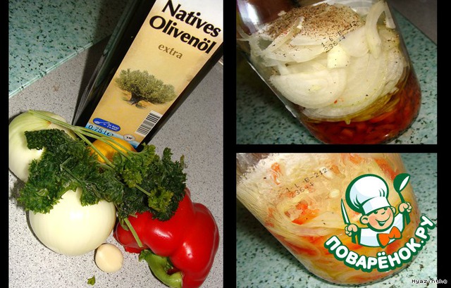 Сначала сделаем маринад: в посуду с крышкой вливаем оливковое масло, добавляем лимонный сок и цедру, очень мелко нарезанные чеснок и болгарский перец, тонко нарезанный лук, соль и перец по вкусу.