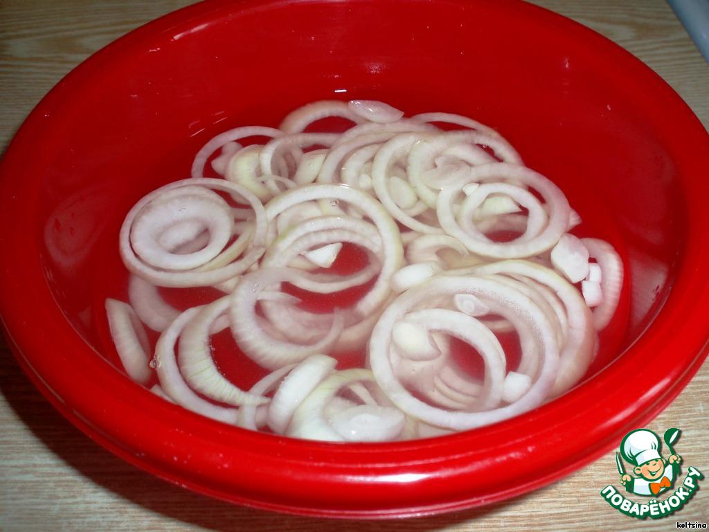 Делаем маринад: смешиваем все составляющие и добавляем лук, порезанный кольцами. Маринад можно сделать сразу или когда рыба уже просолится - это уже по желанию...