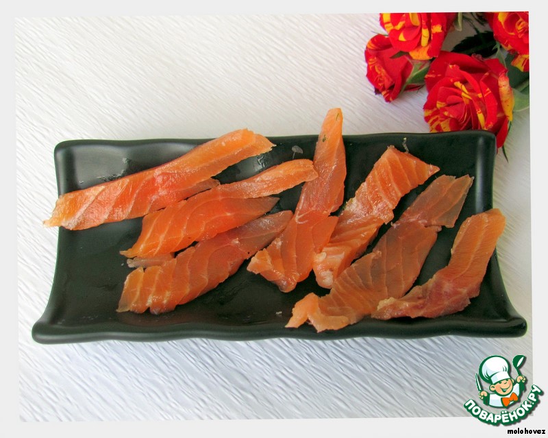 Полоски лосося разрезали пополам, но не до конца, и оформили в виде сердечек вокруг сырного крема.