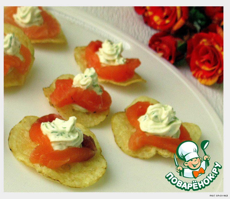 С помощью кондитерского шприца выдавили сырный крем на чипсы.