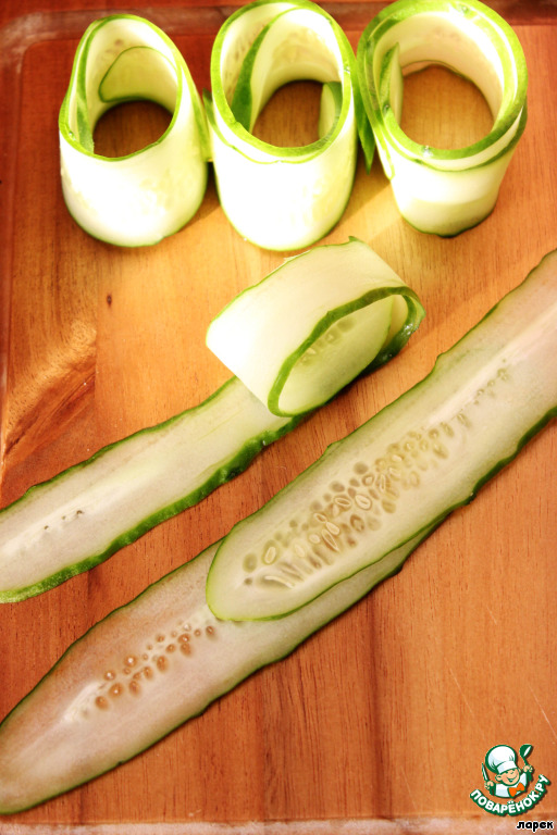 Если у вас есть время, желание и терка Бернер (в крайнем случае - нож-овощечистка или просто твердая рука и хороший глазомер), нарежьте из огурца тончайшие (это важно!) пластины и сверните их так, как показано на фото. Если кое-где края лепестков будут отгибаться - не страшно, впоследствии мы их скрепим каплей мусса. Поставьте огуречные корзинки плотно друг к другу и отправьте в холодильник