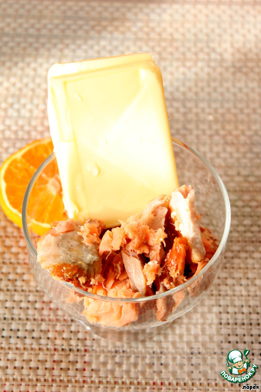 Тем временем займемся муссом. Для него подойдет любая некондиция, оставшаяся от нарезки рыбы, и даже копченые брюшки лосося. Можно взять и копченую сельдь, но тогда закуска сильно проиграет в цвете - не получится этот красивый нежно-розовый оттенок. Итак, рыбу, размягченное сливочное масло, сок апельсина и черный молотый перец пробить блендером до состояния мусса.