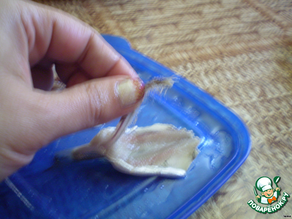 На следующий день можно начинать подготавливать рыбу. Рыбка должна стать светлее и мягче после прибывания в маринаде. Теперь нужно удалить косточки. Если рыба промариновалась достаточно, то хребет из рыбы выходит легко и целиком. Я кладу тушки на спинку и провожу пальцем, и косточки начинают легко отходить.