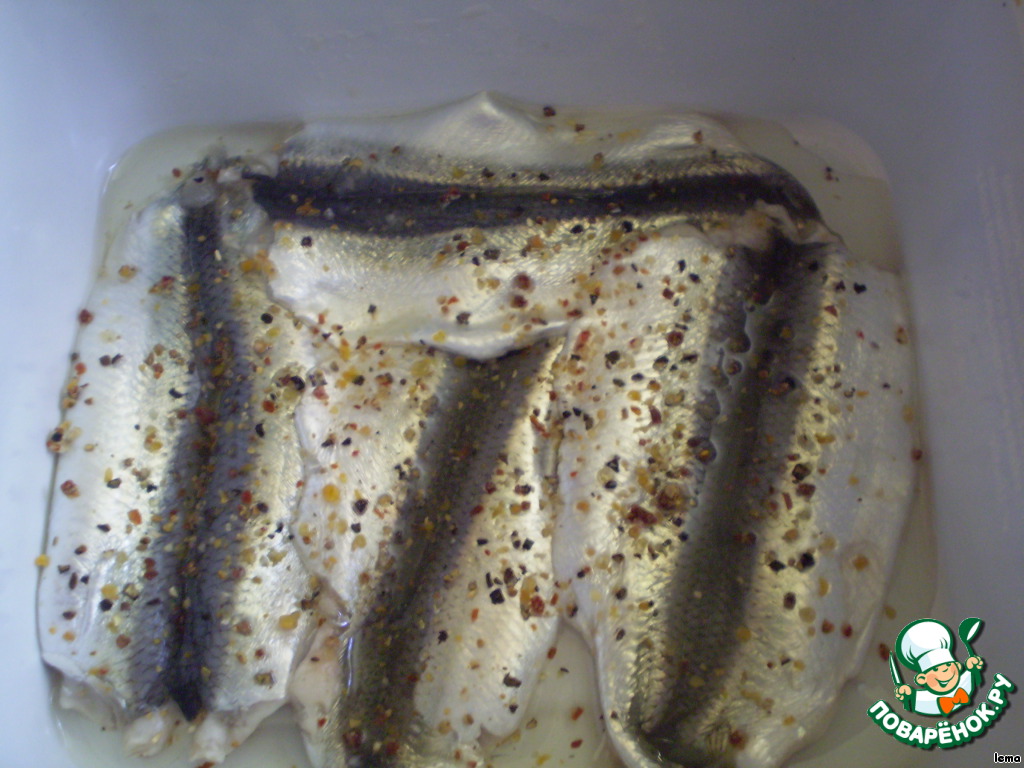 Дальше нужно сложить рыбку в коробочку слоями, пересыпая каждый слой пряностями. На каждый третий слой я наливаю немного масла. Укладываем всю рыбу и слегка придавливаем её. Всё!