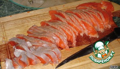 Смешать соль с сахаром. Укладывать кусочки рыбы слоями, посыпая солью и смазывая маслом. Кусочки брюшка укладывать в последнюю очередь сверху и маслом не смазывать.