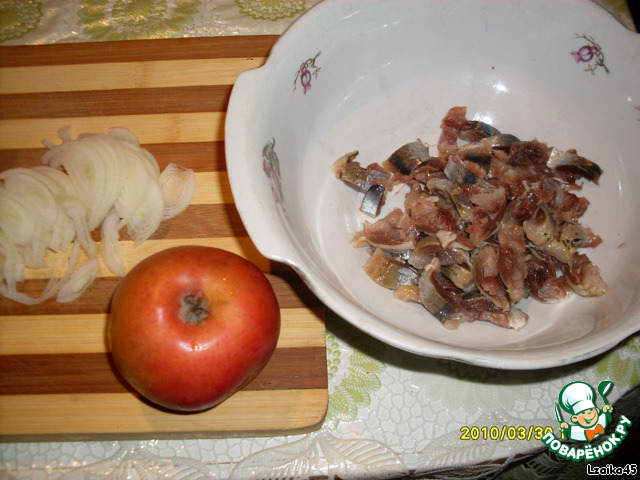 Яблоко трём на тёрке. К селёдке добавляем лук, яблоко