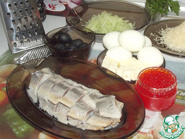Натертый и слегка отжатый огурец выкладываем по краю дольки. Главное не солить натертый огурец, все достаточно соленое! Потом натертый на мелкой терке сыр. На образовавшуюся площадку выкладываем красную икру. С маслин срезаем овальные "косточки" и укладываем на икру. Напоследок по краю огурчика нарезанный зеленый лучок - "корочка".