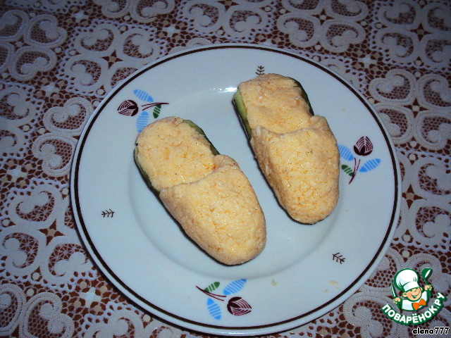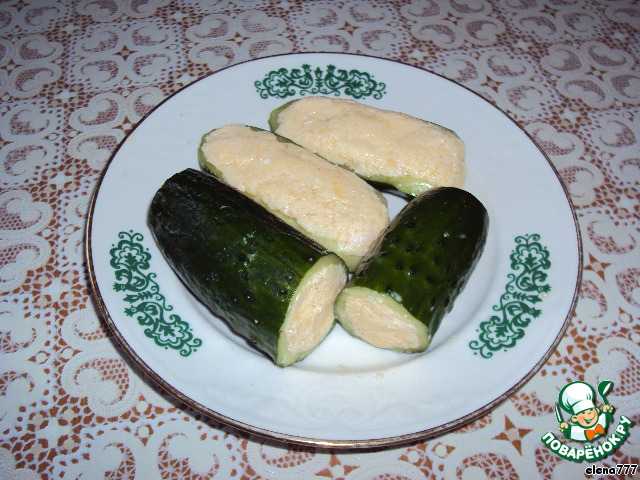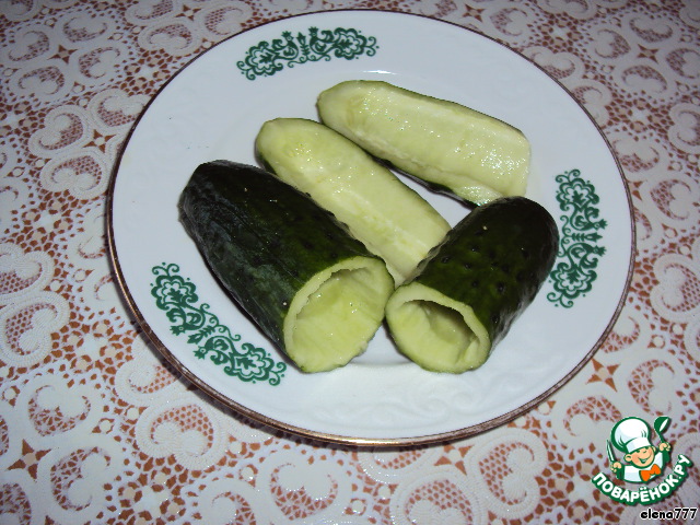 Для первой закуски крупный огурец разрезать пополам поперёк и одну часть (не попку) пополам вдоль, вынуть ложкой мякоть. Для второй закуски огурцы надо разрезать поперёк и аккуратно вынуть мякоть спиралькой или острым ножом.
