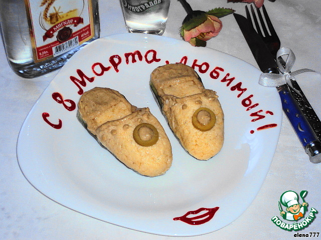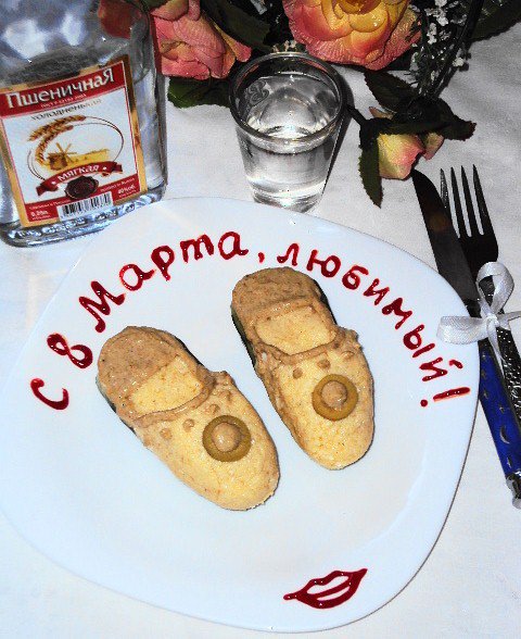 Если вдруг, на 8 Марта, Ваш благоверный случайно забыл Вас поздравить, то быстренько приготовьте закуску "Универсальную" в виде тапочек, плесните стопку водочки, украсьте тарелочку и, со словами: "С 8 Марта, любимый!" поздравьте мужа с Женским Днeм! Тогда, скорее всего, Ваше сокровище сделает Вам ответный подарок
