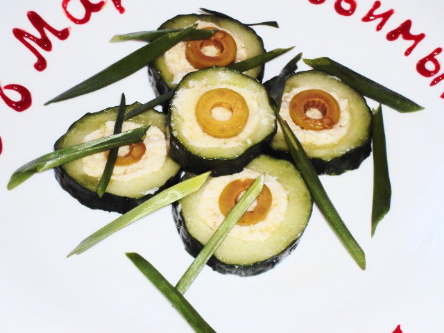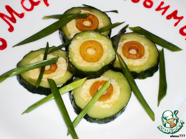 Фаршированные огурцы, разрезанные поперёк, нарезаем на колечки. Украшаем перьями зелёного лука и колечками маслин.