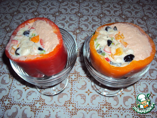 Перцы разделить на две части. Одну начинить лососевой, другую - креветочной массами. Убрать в холодильник на 1.5-2 часа.