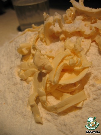 Маргарин (50грамм) надо натереть на крупной терке. Муку (где-то 300грамм) просеять на стол горкой, добавить маргарин и посолить по вкусу.