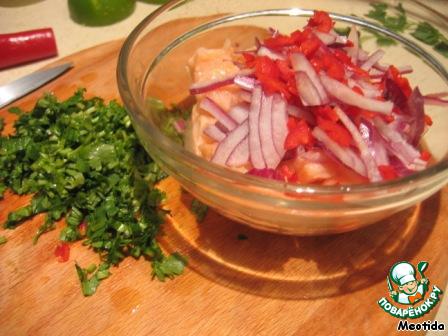В миске смешиваем маринованное филе лосося, перец чили, лук, кинзу, заправляем солью и черным молотым перцем, по вкусу.