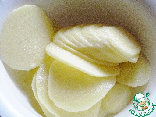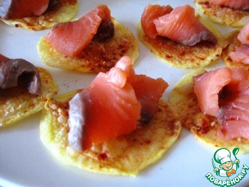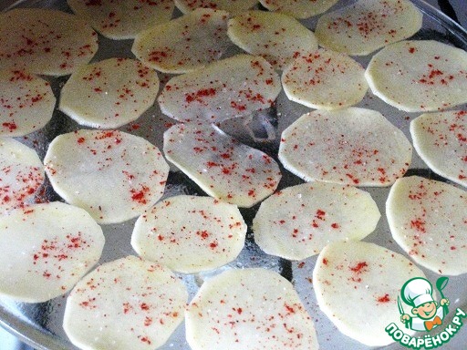 Для закуски на картофельных чипсах:нарежем тонко картофель шинковкой